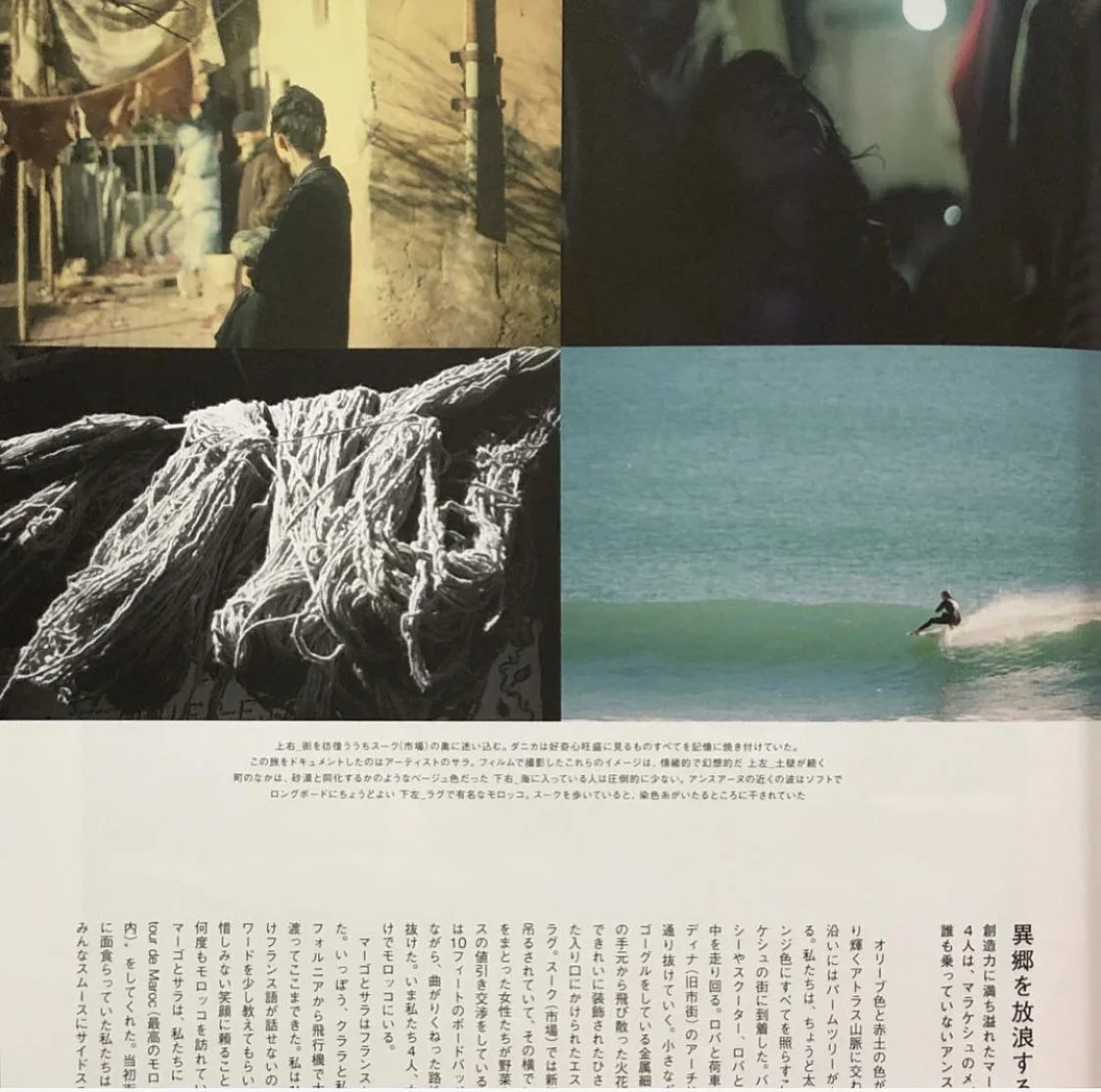 Olive and red earth meet the glowing Atlas mountains, and there are palm trees along stone walls. We arrive in an orange glow as we make our way into Marrakech. Vans, taxis, scooters, carts and donkeys all make their way through the archways of the medina, the old city. There are sparks from the metalworkers wearing tiny glass goggles, rugs hanging along canopy openings and tiled doorways. Fresh meat is hung and hooded women bargain for vegetables and spices. We make our way through the winding alleys with a ten foot surfboard bag. There are four of us, just girls, in Morocco.